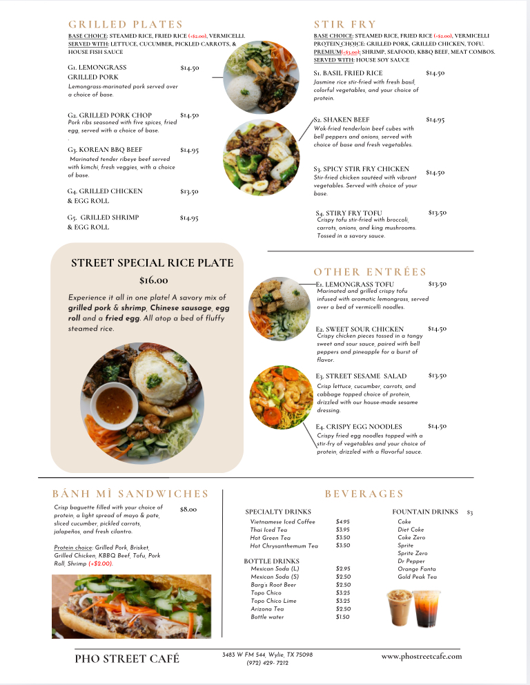 Welcome to Phở Street Cafe, a vibrant culinary gem nestled in the heart of Wylie, Texas. Located at 3483 FM 544 #110, this cafe transports you straight to the bustling streets of Vietnam, serving a delightful array of traditional dishes that encapsulate the essence of authentic Vietnamese cuisine. With a commitment to using fresh ingredients and no MSG, Phở Street Cafe takes pride in offering meals that are not only flavorful but also wholesome.